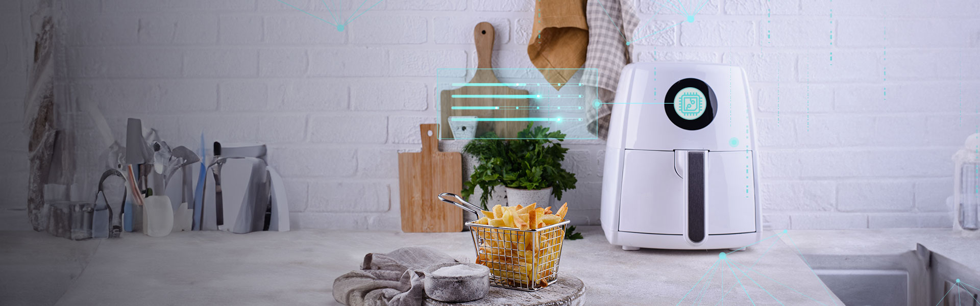 空氣炸鍋智控由主控板、顯示操作界面及TFT 智能旋鈕、WIFI 模組,語音識別,手勢識別模組組成。空氣炸鍋通過以下功能特點讓產品更加智能化,從根本上提升了用戶的便利性和體驗。手機監控空氣炸鍋行狀態;手勢識別功能;語音識別功能;TFT LCD 旋鈕屏;